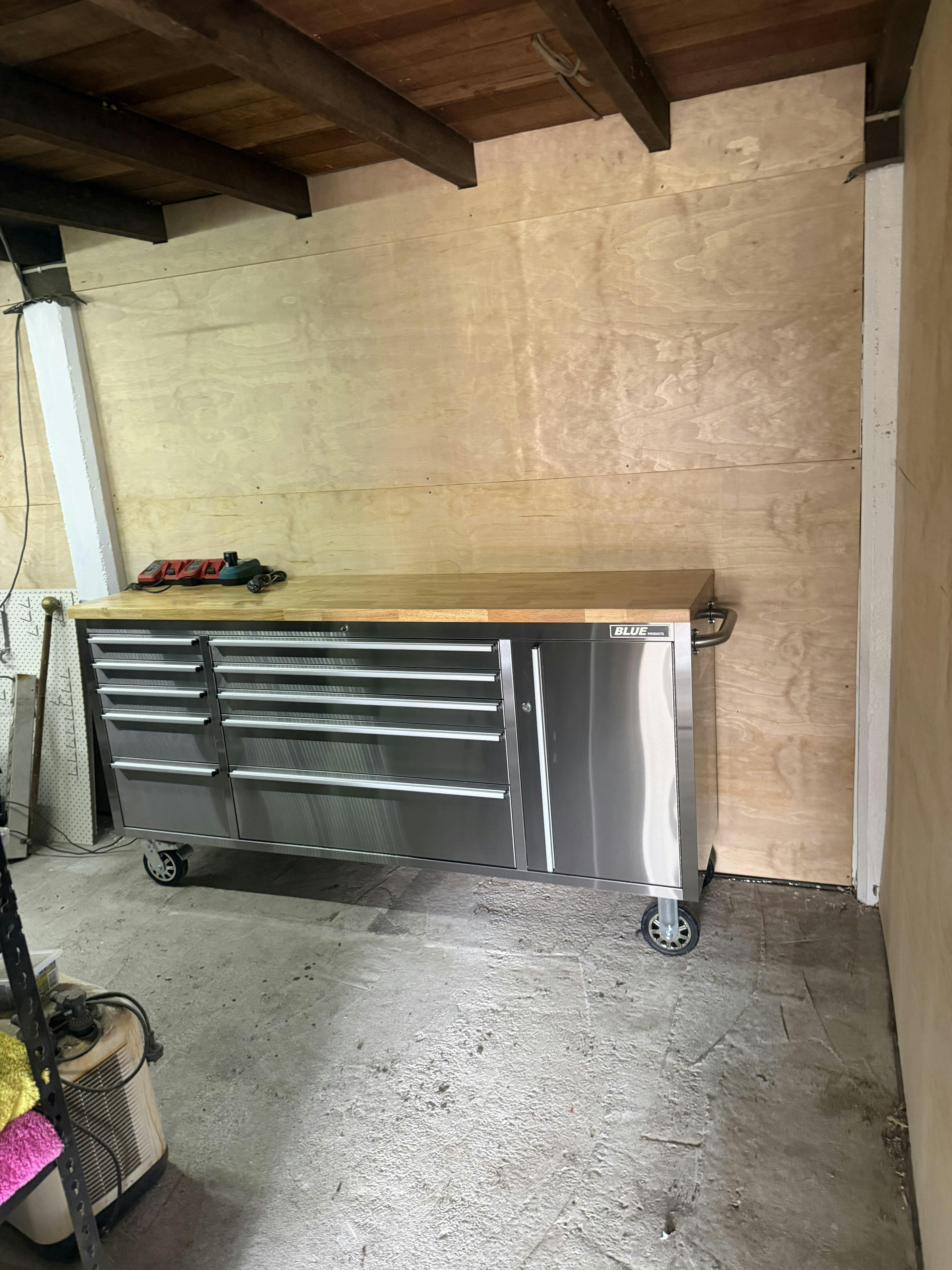Quality stainless steel garage workbench with 10 drawers, top cabinet set with shelves and pegboard combination on wheels (castors) to move easily. Easily mount a vice on to the bench if you wish or other items. This unit is made with top material. The pegboard area has eyelets for power cords to easily add power plugs or lights. the drawers have smooth 100lbs weight capacity ball bearing slides for each access.